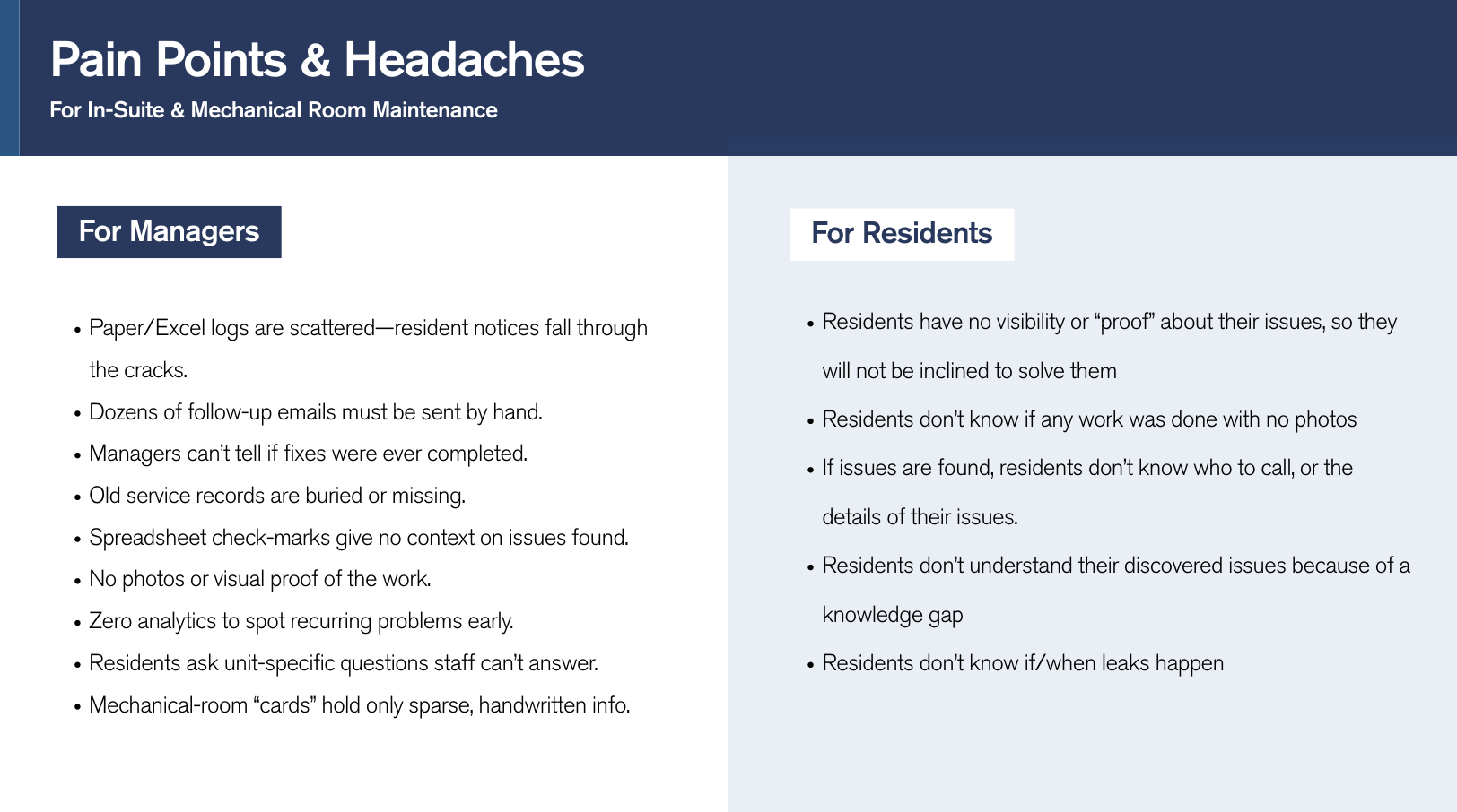 - Residents: no visibility into what was found or what was fixed, no photos, and no clear next steps—so issues linger and support tickets multiply.